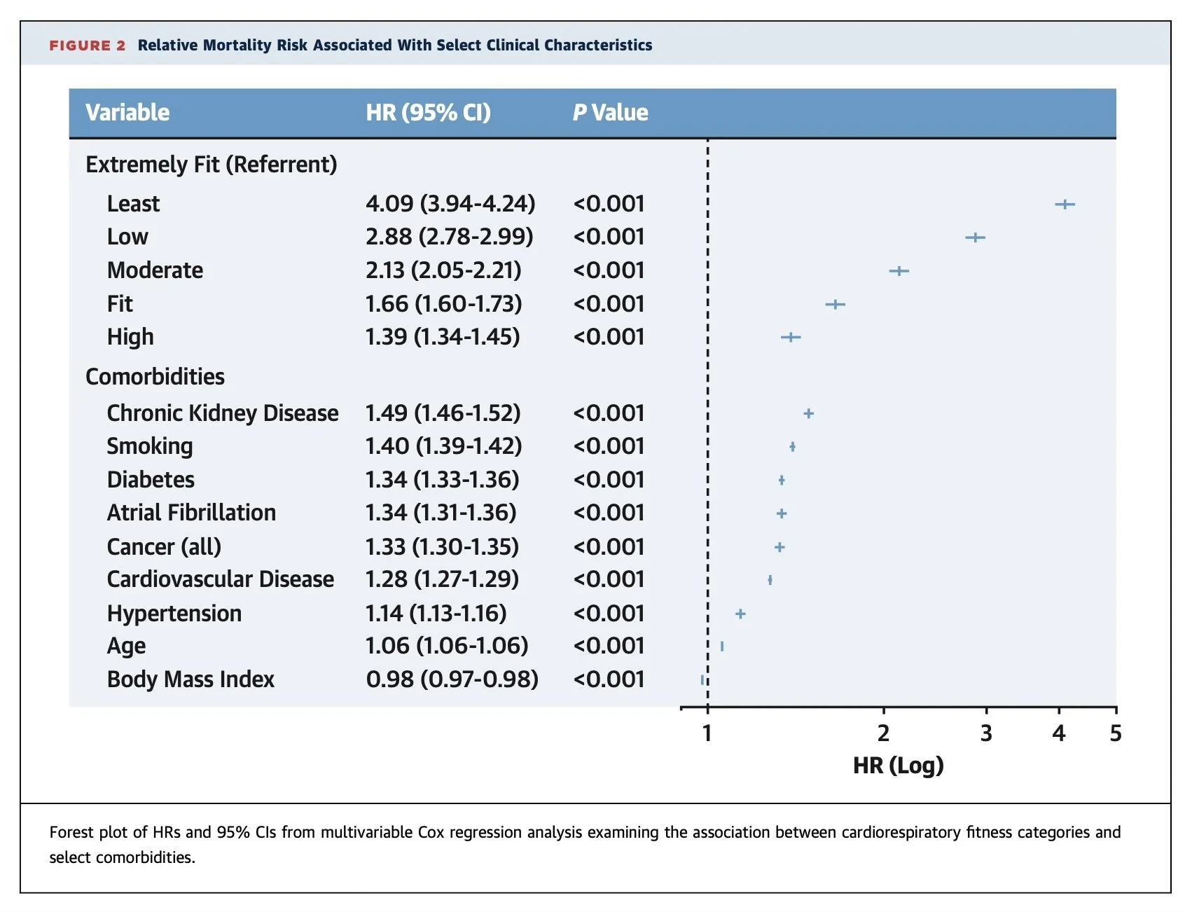 The chart is worth understanding. Every bar represents mortality risk relative to the extremely fit category, which anchors at 1.0 on the left. A hazard ratio of 2.0 means you're twice as likely to die from all causes; 4.0 means four times. Notice where the fitness categories land compared to the more commonly tracked comorbidities in the lower half of the chart: