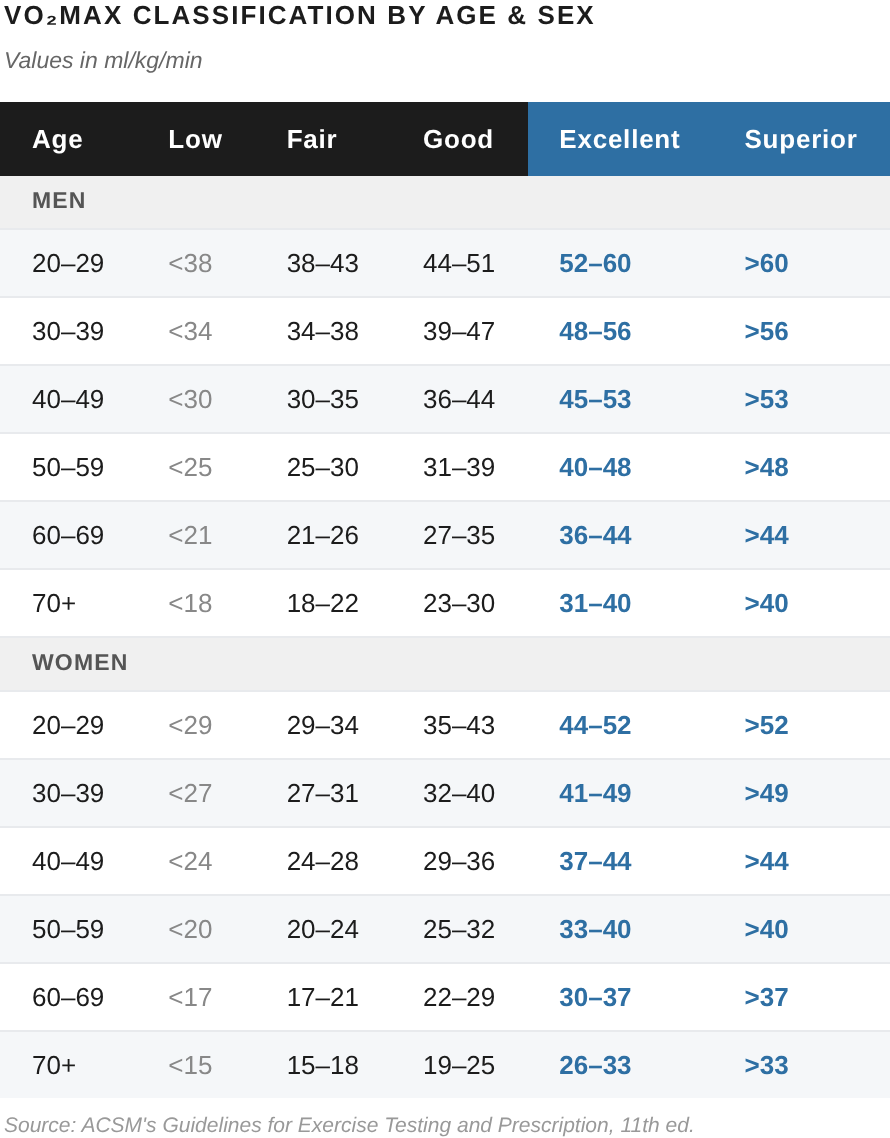 The American College of Sports Medicine publishes the most widely used classification system for VO2max values. Reference ranges by age and sex (ml/kg/min):