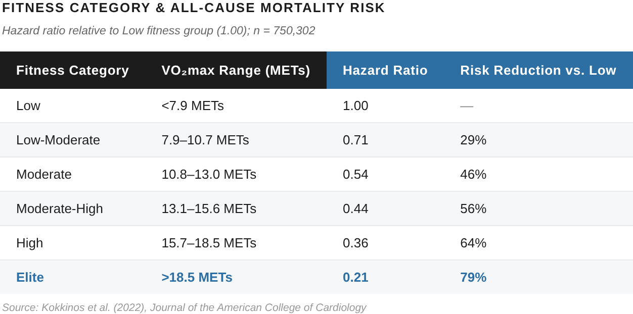 The clearest picture comes from the Kokkinos 2022 JACC data we introduced in Part 1. Using "Extremely Fit" as the referent (HR = 1.0), the hazard ratios show how many times more likely you are to die at each fitness category below it: