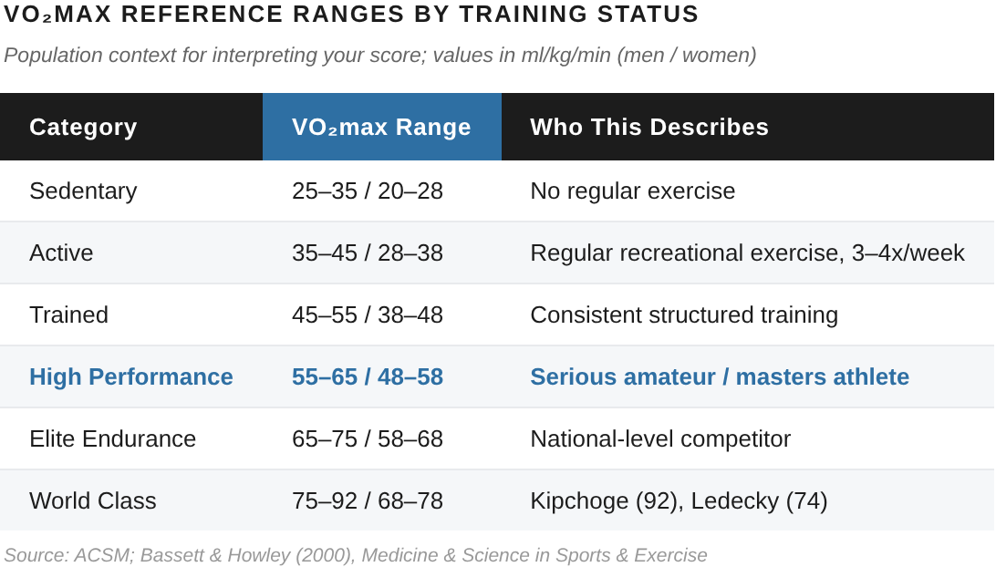 For a 50-year-old man, 47 ml/kg/min sits at the upper end of "excellent" on the ACSM table. For most 50-year-old executives, it's also 10–15 ml/kg/min higher than where they currently are. The good news is that it's a completely achievable number, even within the constraints of a busy life. It requires deliberate training, though not crazy training volume. But you also won't get there without an intentional plan.